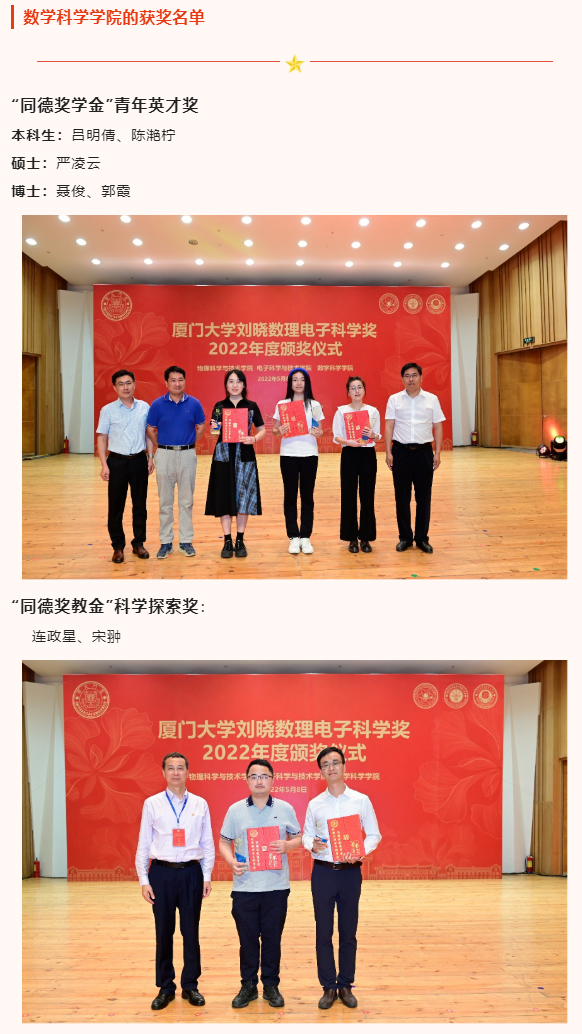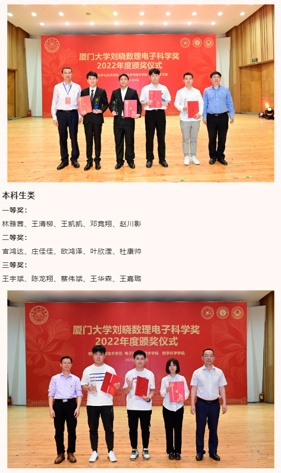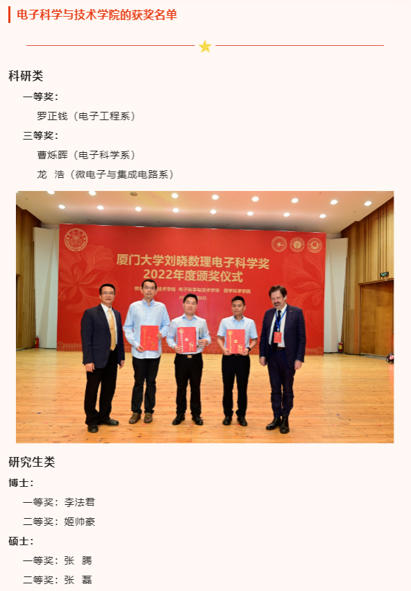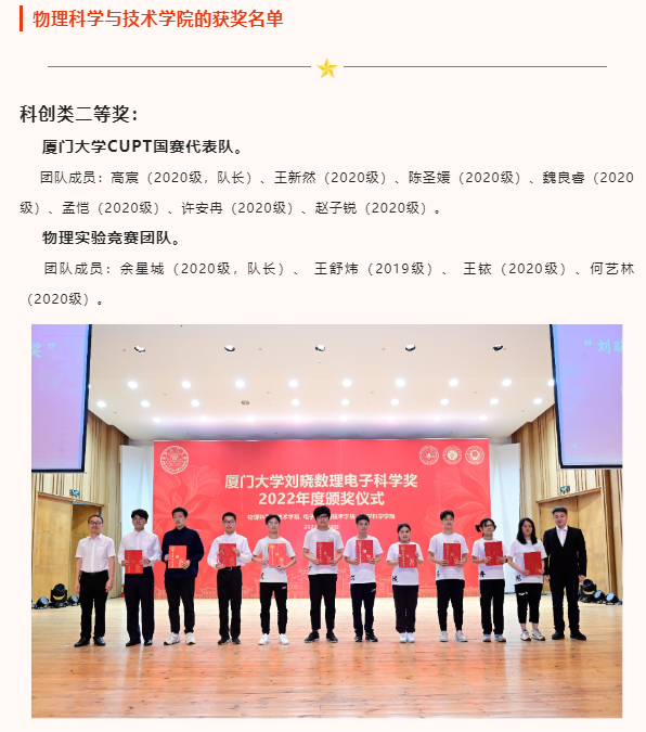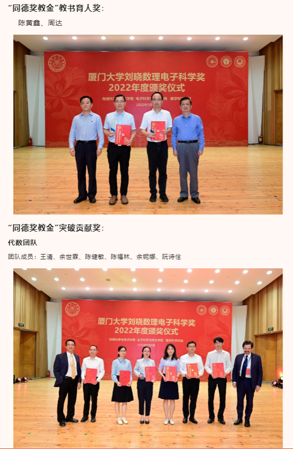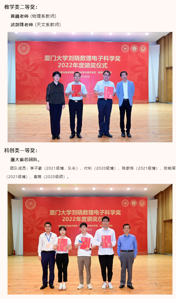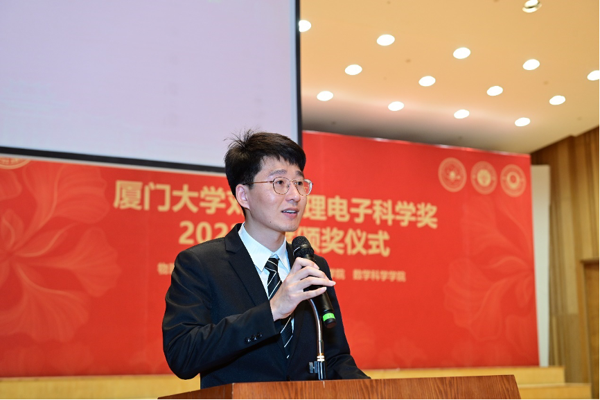 此外,出席本次颁奖典礼的还有物理科学与技术学院党委书记李书平,党委副书记郑诚明,副院长陈理想,副院长陈张海,副院长黄凯等老师;电子科学与技术学院院长陈忠,党委副书记方银水,副院长董俊等老师;数学科学学院党委书记黄宝秋,bat365在线平台南强杰出贡献奖获得者、数学科学学院钟同德,党委副书记毛通双,副院长张剑文,副院长金贤安,副院长宋翀等老师。以及三个学院获奖师生和学生代表参加了颁奖典礼。颁奖典礼由物理科学与技术学院党委副书记郑诚明主持。