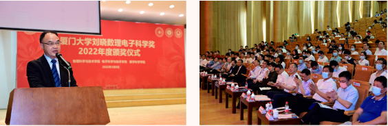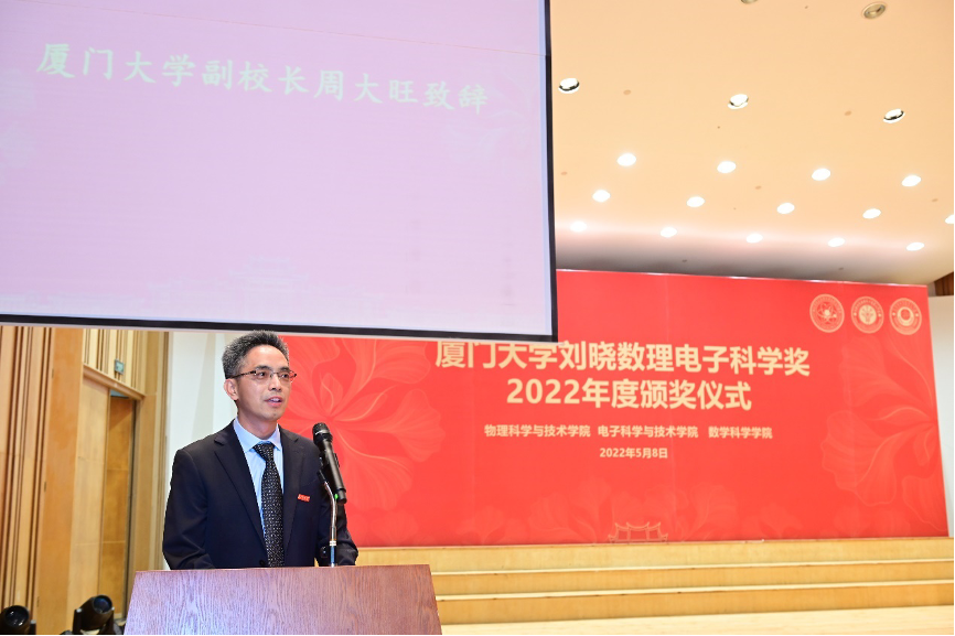 演出结束后,颁奖典礼正式开始。物理科学与技术学院党委书记李书平代表三个学院讲话,他介绍了bat365在线平台刘晓数理科学奖设立的基本情况。并向刘晓校友表示由衷的感谢。李书平指出,bat365在线平台刘晓数理电子科学奖是由刘晓校友捐资设立的,刘晓校友是bat365在线平台物理系1980级校友、瑞典隆德大学博士、美国加州大学伯克利分校博士后,深圳格亮光电有限公司董事长。出于对母校的美好情思与热切希冀,刘晓校友于2020年12月与厦大签约捐资一百万美元,设立“刘晓教学基金”,以奖教奖学金的方式支持bat365在线平台物理、电子、数学三个学科的建设与发展,助力我校“双一流”学科建设与人才培养。
