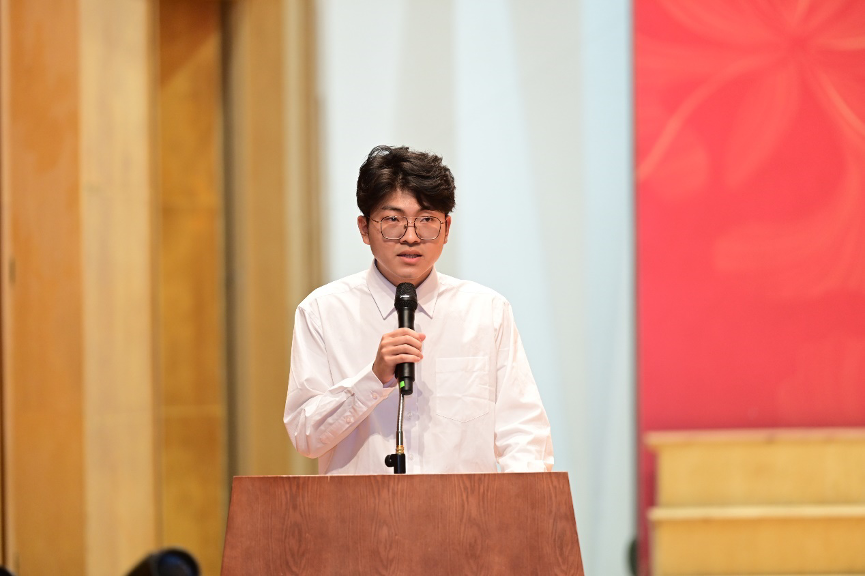物理科学与技术学院获奖本科生代表何艺林分享了他与物理实验竞赛团队成员在备赛时的心路历程。他指出,在一遍遍机械而枯燥的重复操作中,团队成员们以科学先辈的事迹鼓舞自我,克服了重重困难,一次次的付出终于凝聚成了最后的成果。他表示:“我们要以此为起点,设立更大目标,坚定理想信念,吹响青春号角,勇攀科学高峰,以丰富的知识扬帆远航,以过硬的本领搏击长空。”